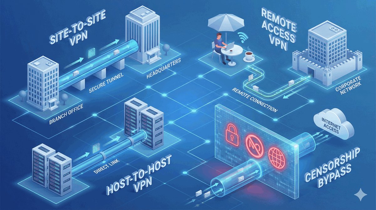 Site-to-Site (LAN-to-LAN): Łączenie całych oddziałów firm. Routery negocjują tunel,