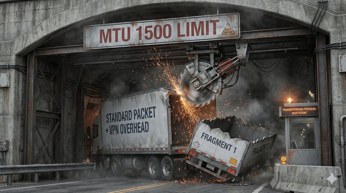 Dodanie nagłówków VPN do pakietu o rozmiarze 1500 B spowoduje przekroczenie MTU sieci fizycznej.