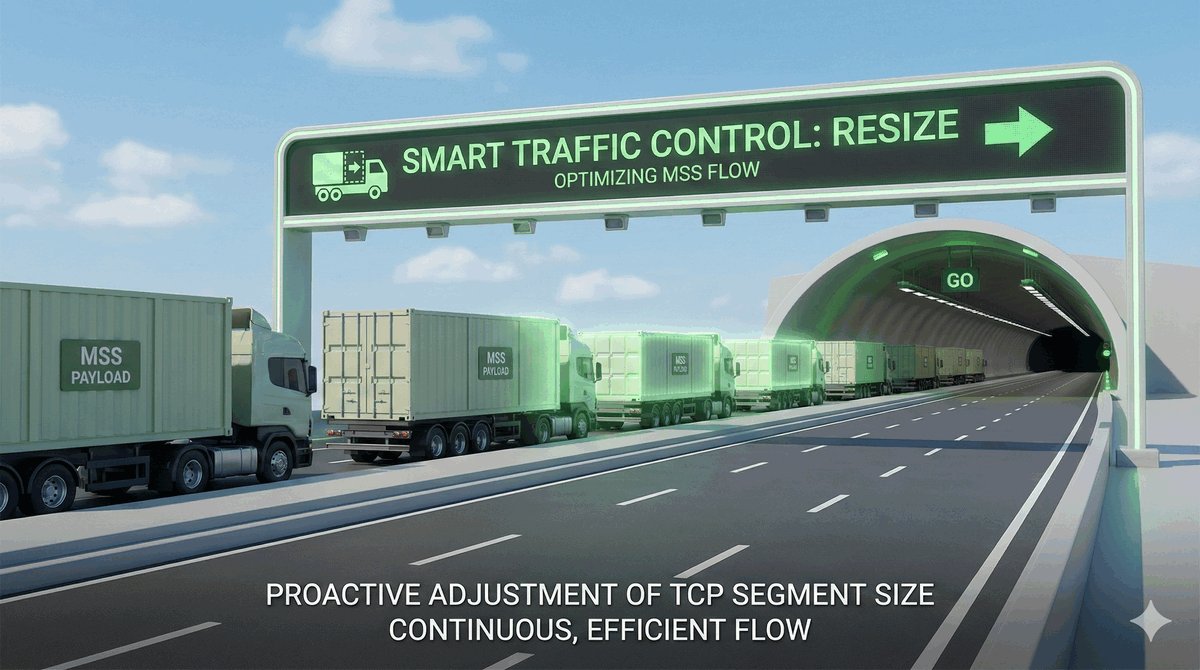 W tunelach VPN routery brzegowe modyfikują pakiety podczas nawiązywania połączenia (TCP Handshake), wymuszając bezpieczną wartość MSS.