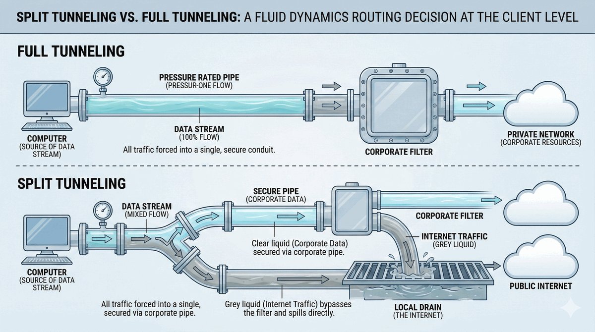 Full Tunneling (Redirect Gateway): Cały ruch z urządzenia (w tym dostęp do Internetu) jest kierowany do tunelu VPN.