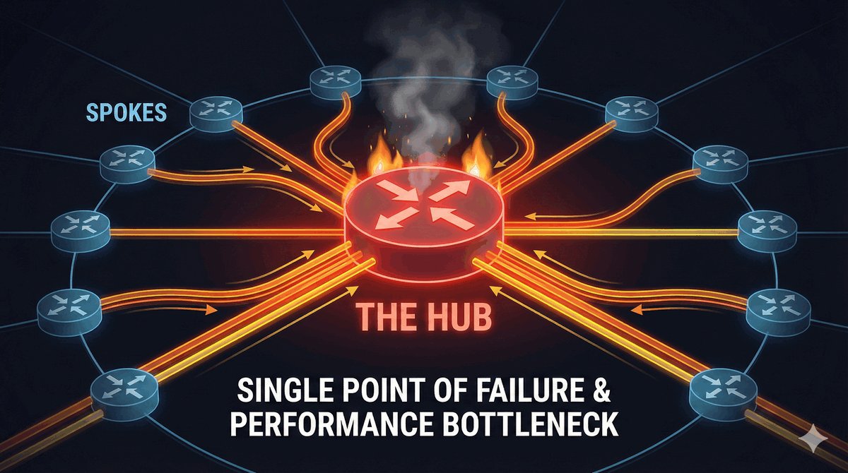 Jeden centralny węzeł (Hub) oraz wiele węzłów podrzędnych (Spokes) w oddziałach.