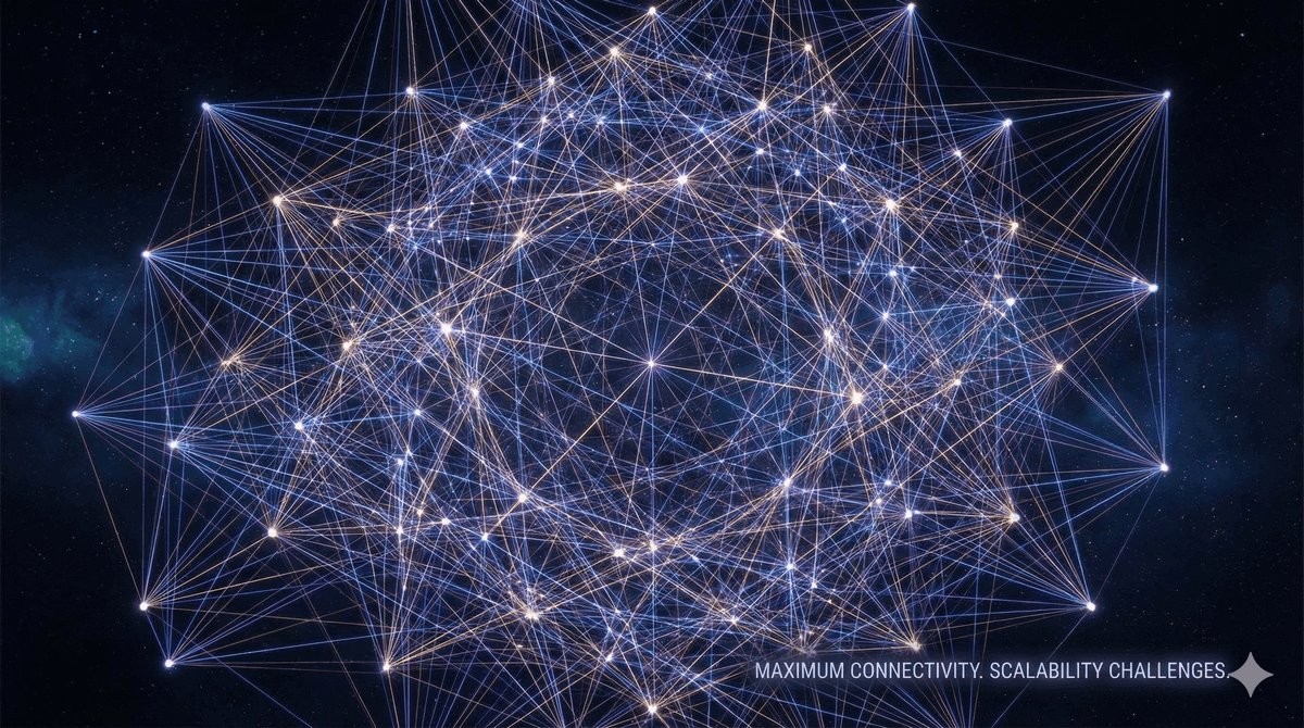Zalety: Minimalne opóźnienia, najwyższa niezawodność i brak punktu centralnego.