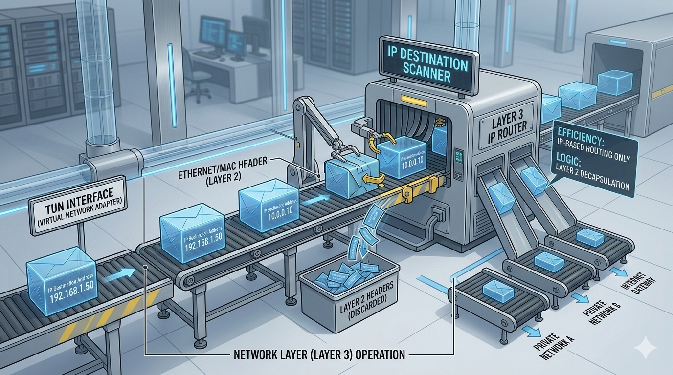 Tablica routingu decyduje, czy pakiet ma trafić do karty fizycznej (eth0), czy do wirtualnej (tun0).
