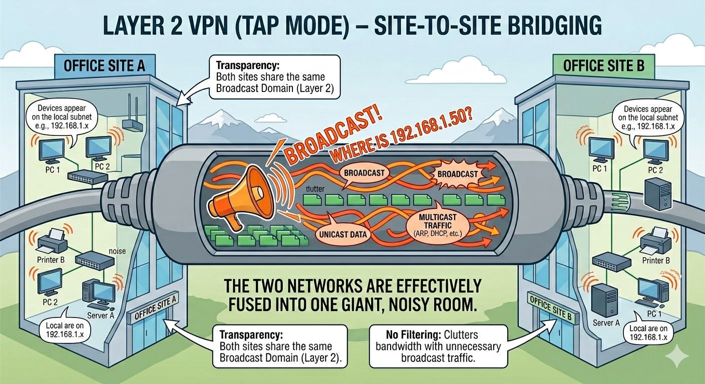 Wymaga stworzenia mostka (Bridge) między interfejsem VPN a fizycznym interfejsem LAN.