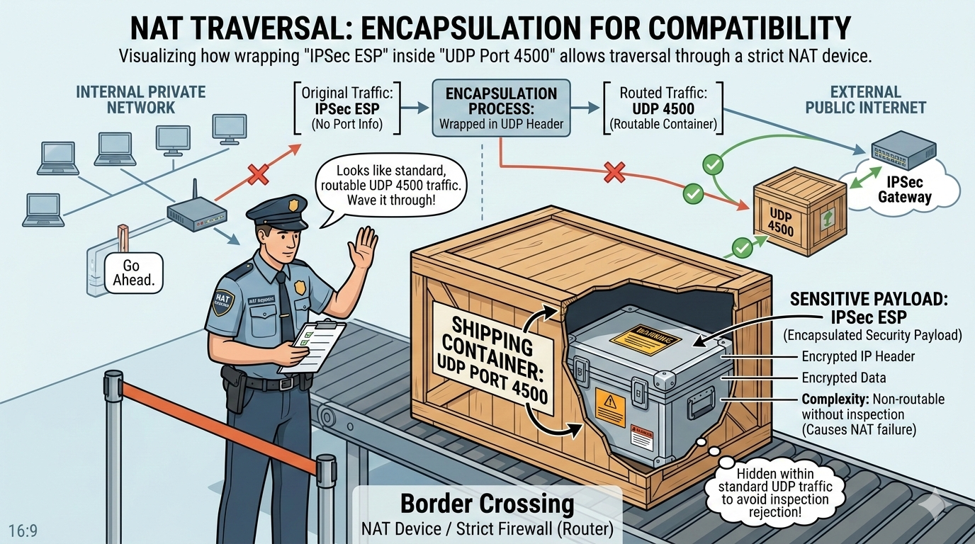 NAT-T to rozwiązanie, które pakuje zaszyfrowany pakiet ESP w dodatkowy nagłówek UDP (zazwyczaj port 4500).