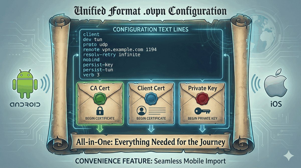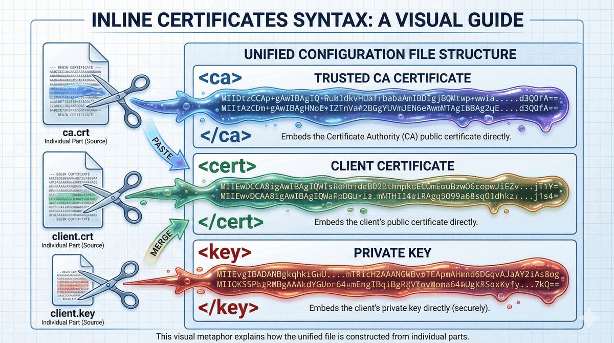 Umieszczenie danych PKI wewnątrz pliku konfiguracyjnego zwiększa wygodę i bezpieczeństwo dystrybucji.