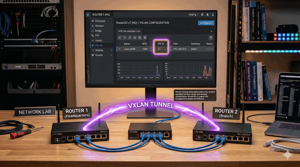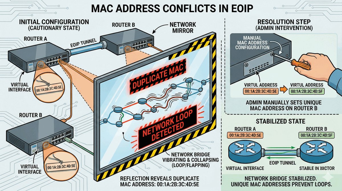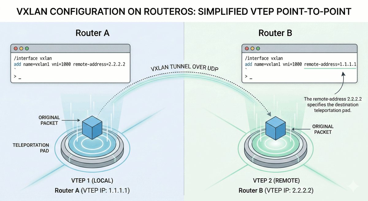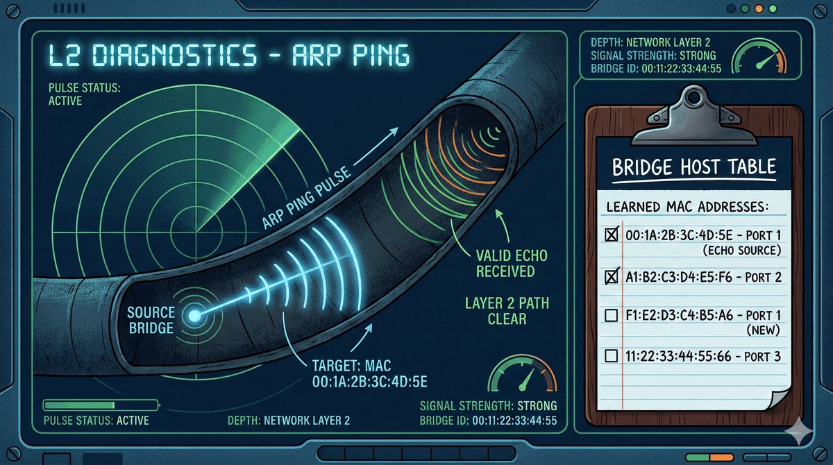 /ping 192.168.1.1 arp-ping=yes./interface bridge host print.VXLAN wypiera powoli EoIP ze względu na bycie standardem multi-vendor (np. możliwość połączenia MikroTik z serwerem Linux/VMware).